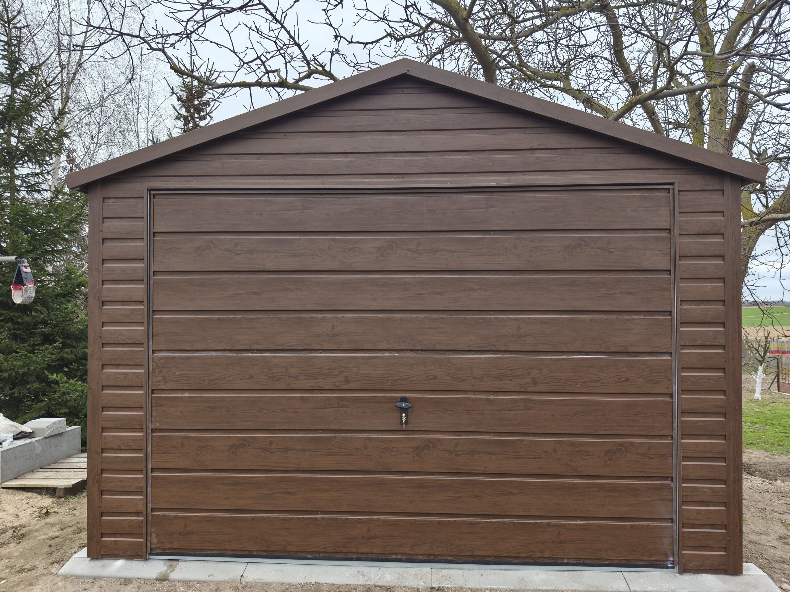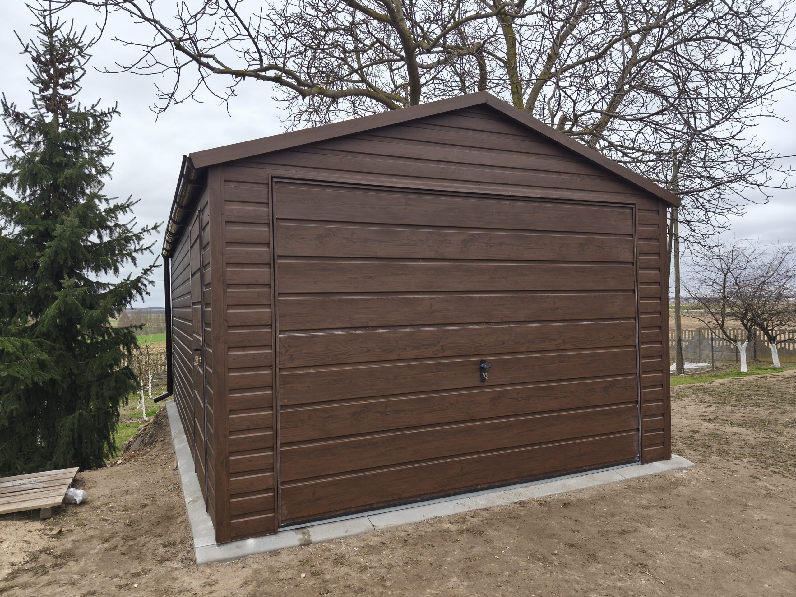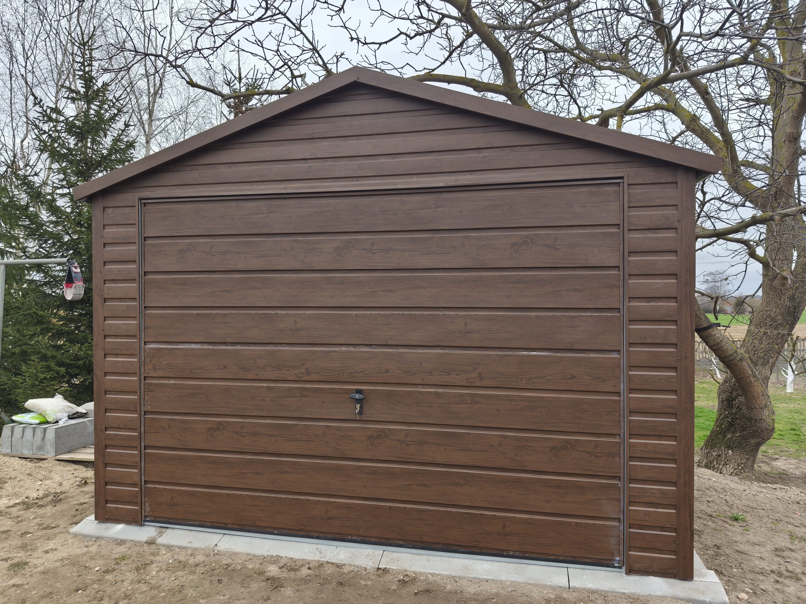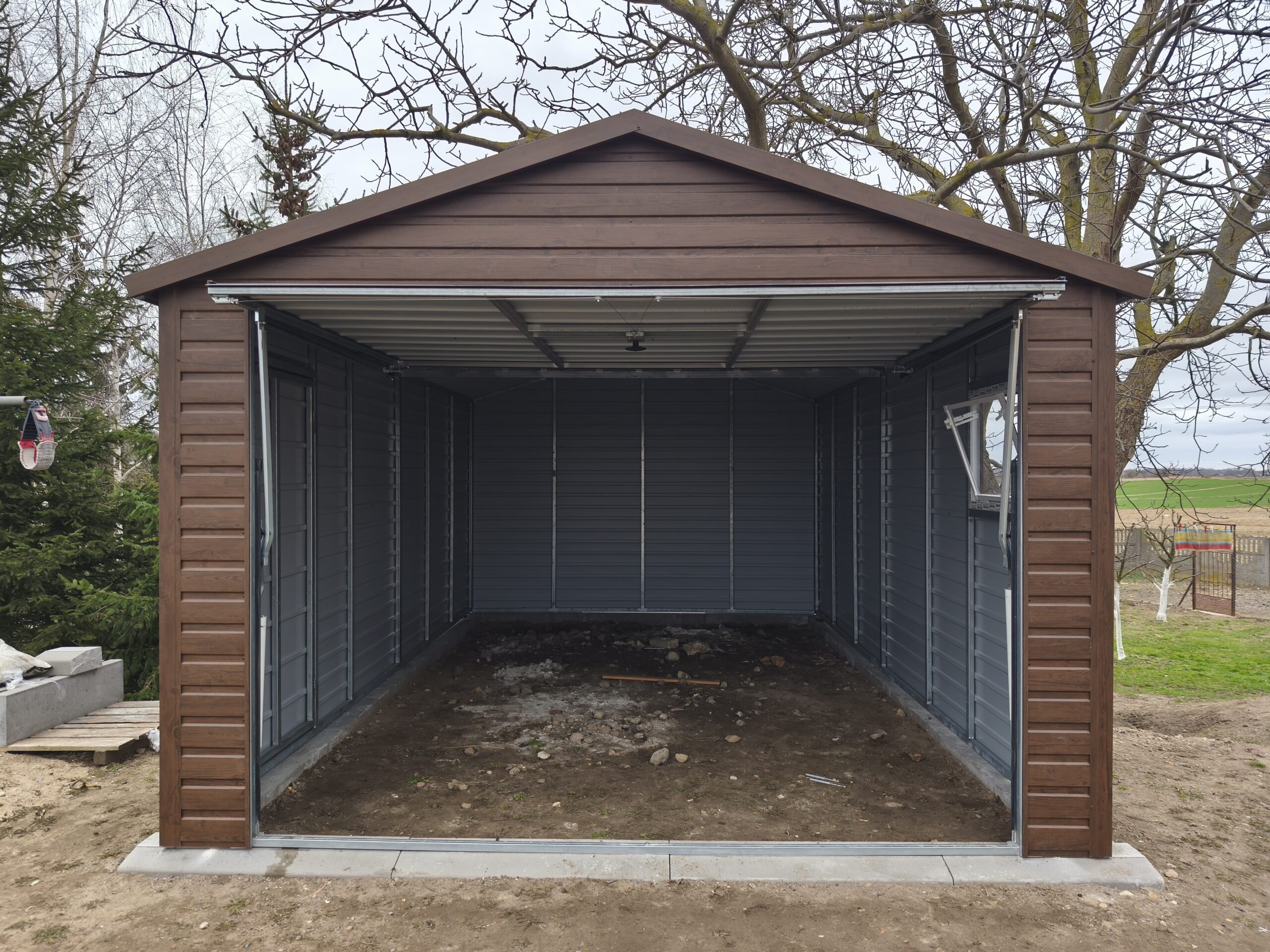 Garaż metalowy o wymiarach 3,5m x 6m z dachem dwuspadowym, bramą uchylną, bramą, oknem i kompletnym wyposażeniem