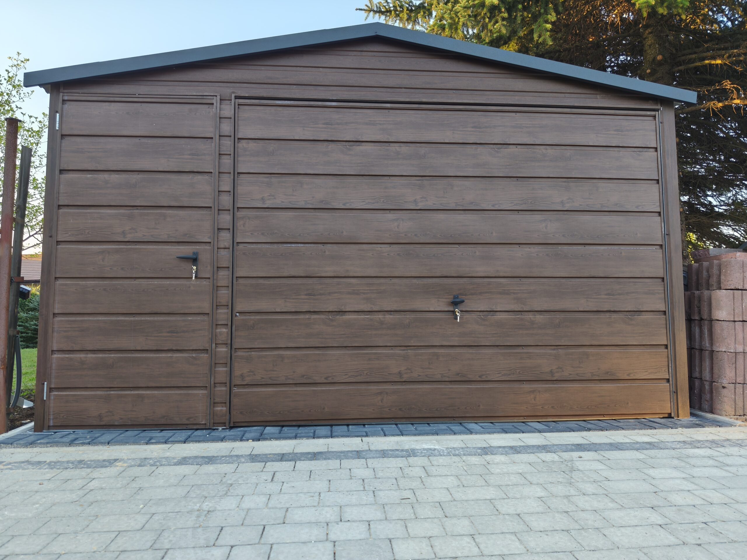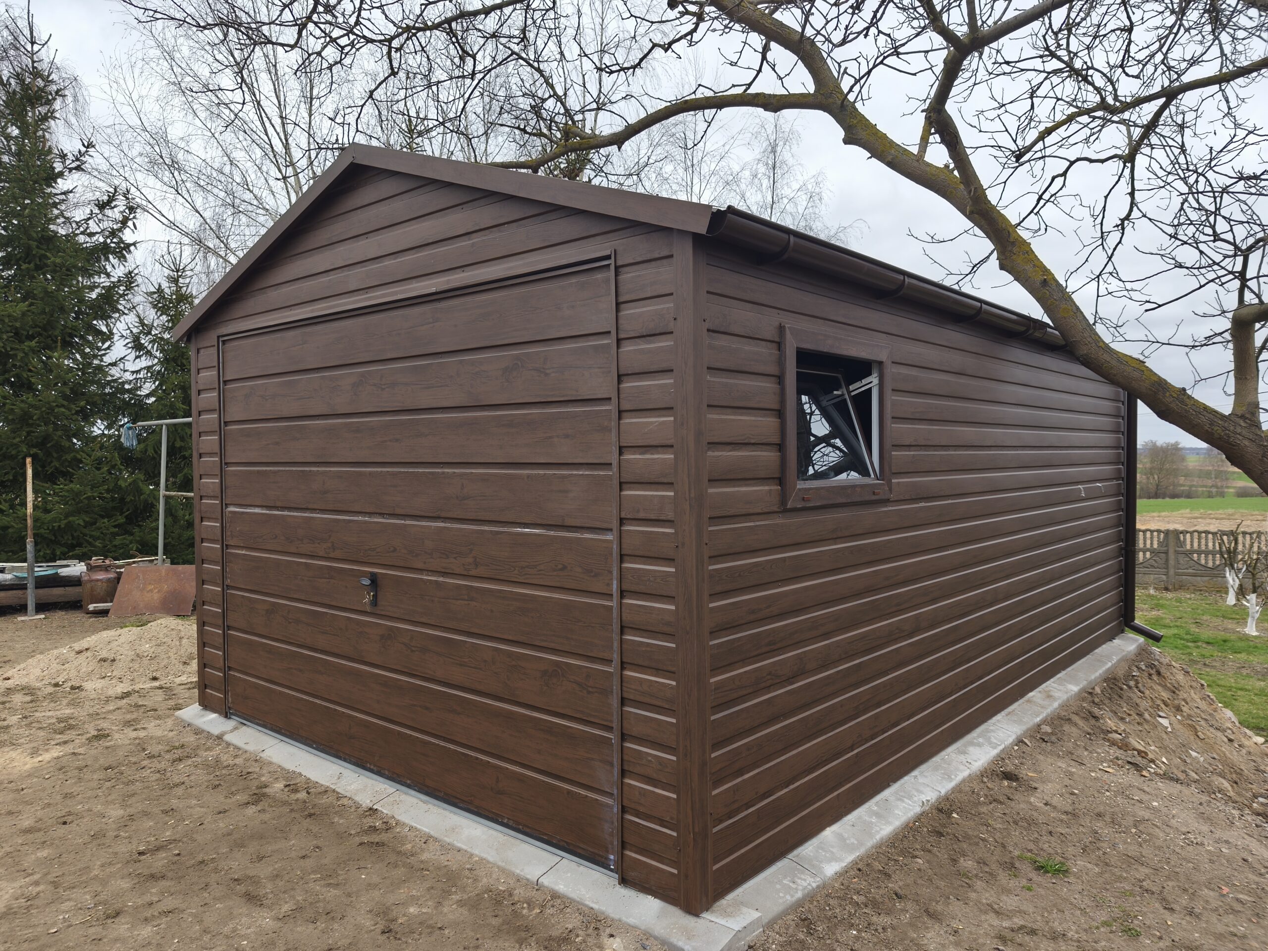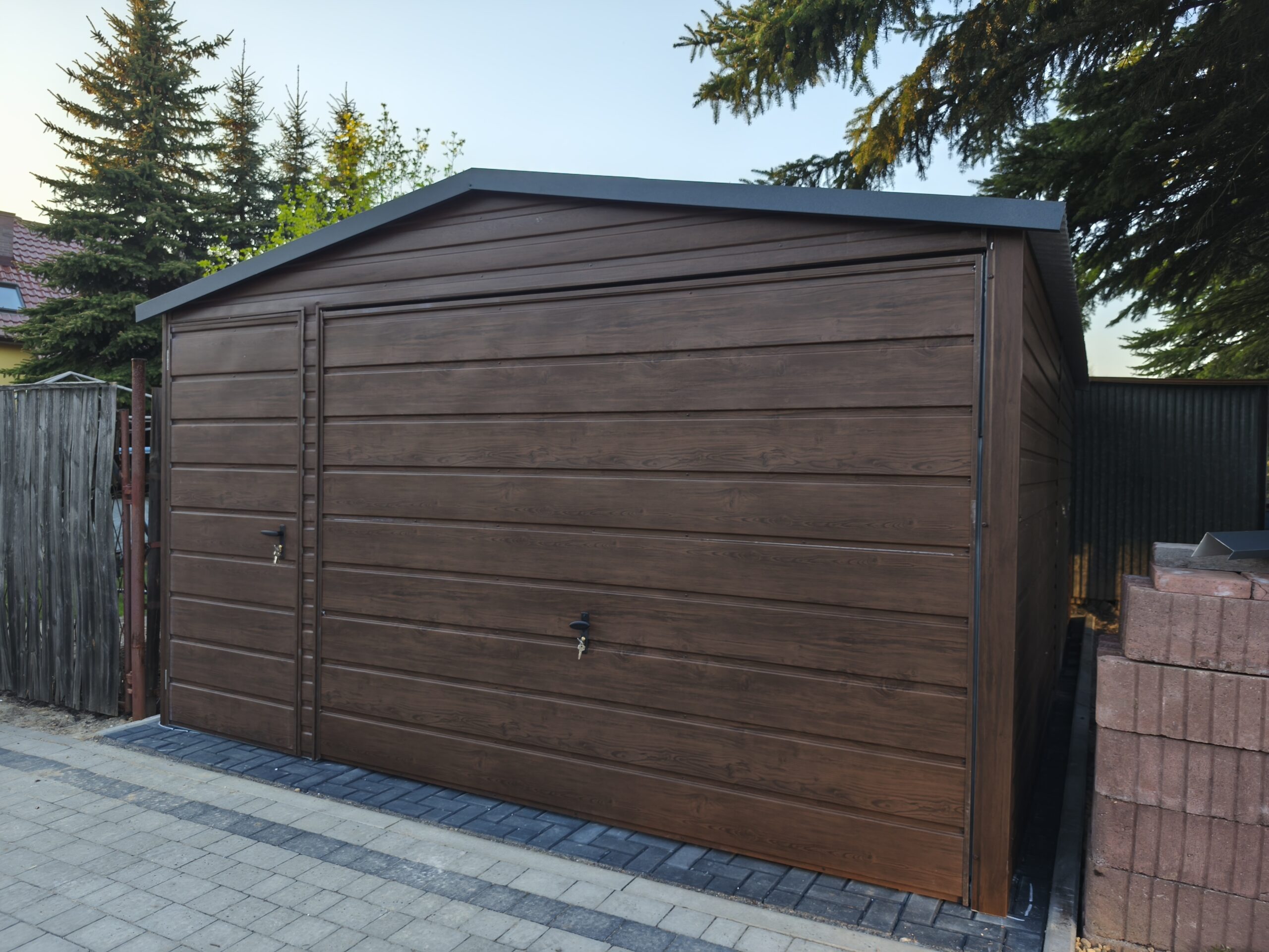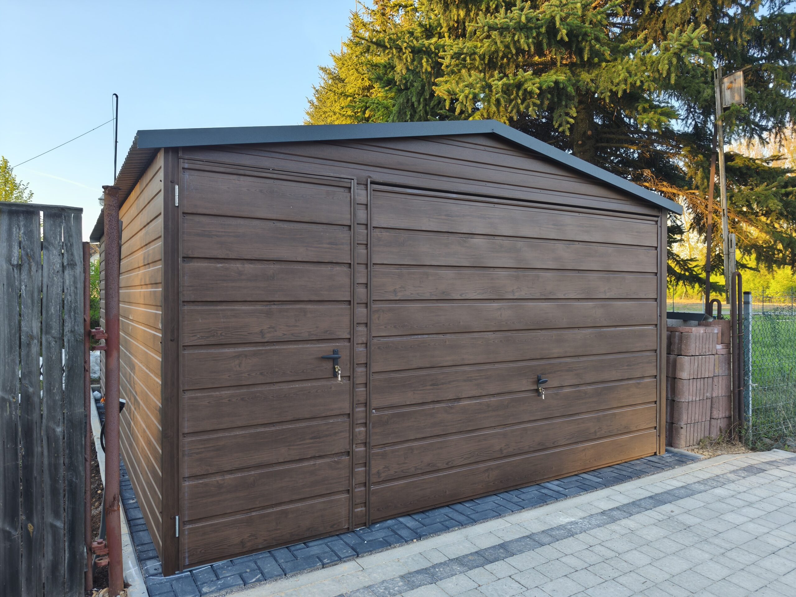 Garaż metalowy o wymiarach 4m x 5m z dwuspadowym dachem, bramą uchylną, bramą i profesjonalnymi wykończeniami
