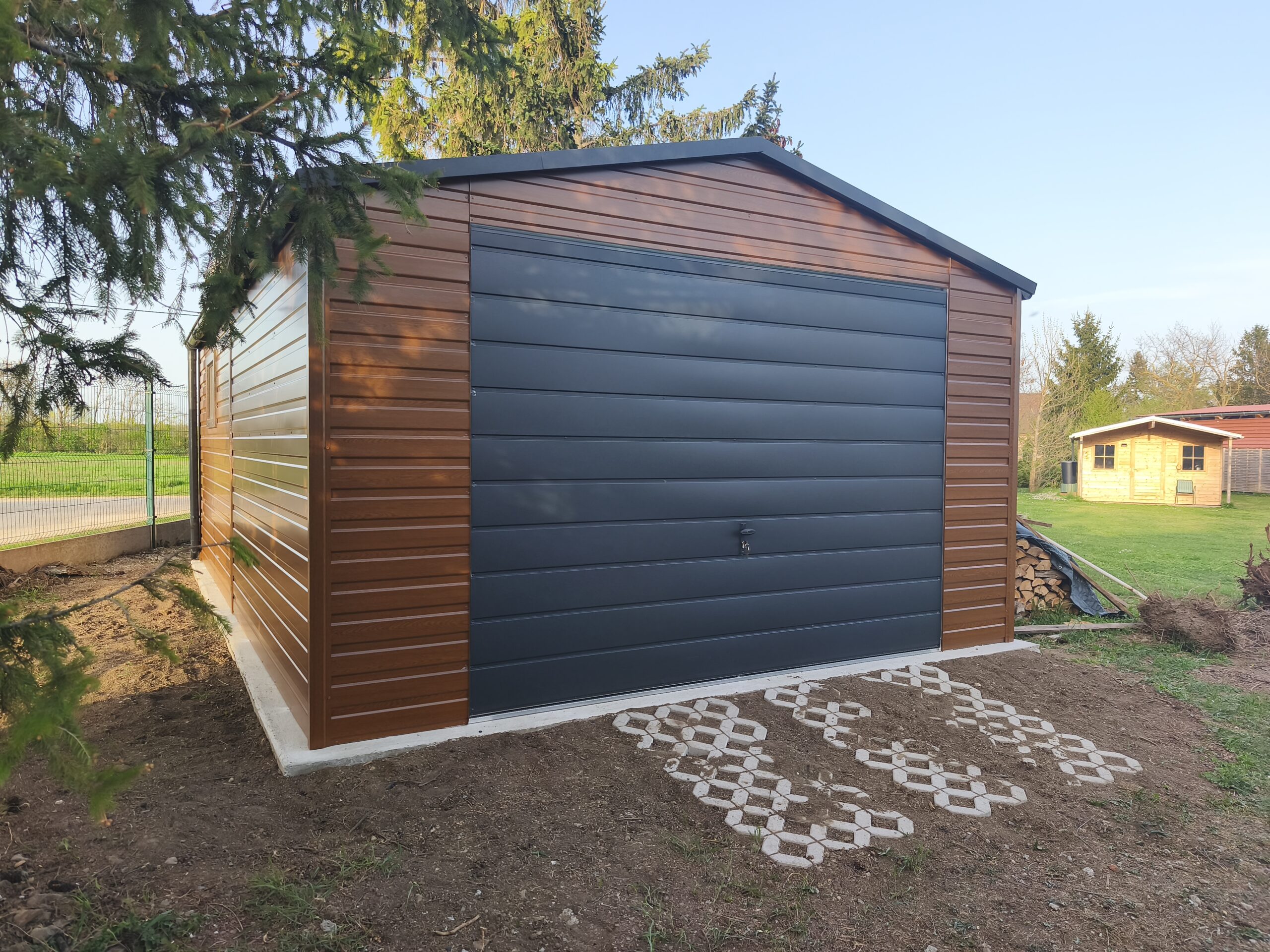 Garaż metalowy 4m x 6m z dachem dwuspadowym, bramą uchylną i kompletnym wyposażeniem